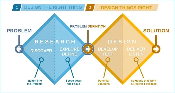 각 단계는 확산(Discover, Develop)과 수렴(Define, Deliver)을 반복하며, 이를 통해 창의적이면서도 체계적인 디자인 프로세스를 만들어갑니다.