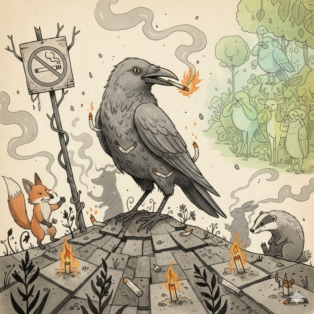 (담배를 피우고, 꽁초를 깔끔하게 휴대용 재떨이에 넣음. 주변을 둘러보며 "나는 매너가 좋으니 괜찮아"라는 듯한 표정.)