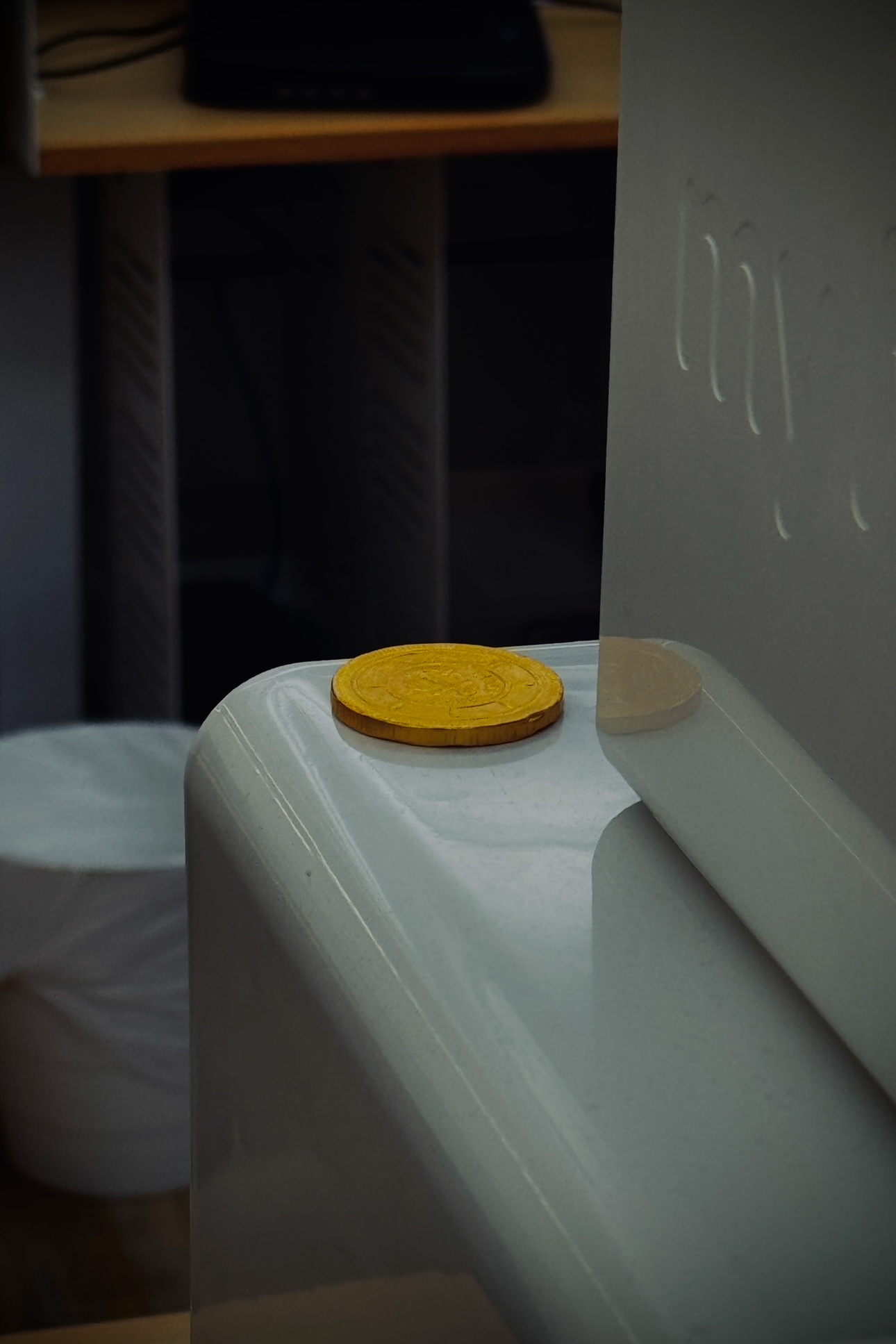 그렇게 몇 달이 흘렀다. 나는 가끔 고개를 숙여 동전 초콜릿이 잘 있는지 확인했고, 동전은 무사히 잘 있었다. 그러던 어느 날, 책상에 앉았는데 맞은편 책상 위에 그 동전 초콜릿이 놓여 있었다. 내 맞은편은 대표님의 자리였다. 청소 아주머니께서 드디어 발견하시곤 대표님 책상에 올려두신 것 같았다. 아무래도 동전이 내 책상보다는 대표님 책상 쪽에 더 가깝게 떨어져 있었나 보다.