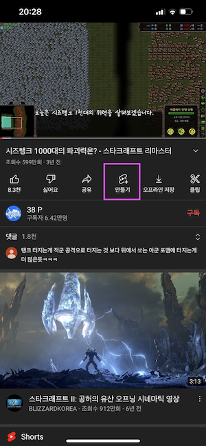 이를 터치하면 보고있는 영상을 기반으로 shorts를 만들 수 있습니다. |