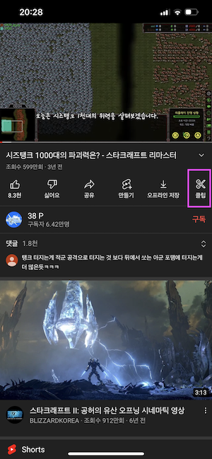 이를 터치하면 보고있는 영상을 기반으로 shorts를 만들 수 있습니다. |