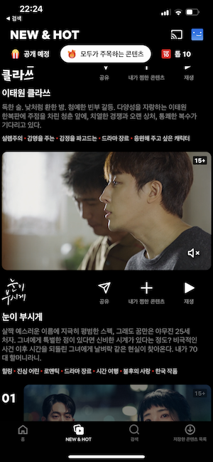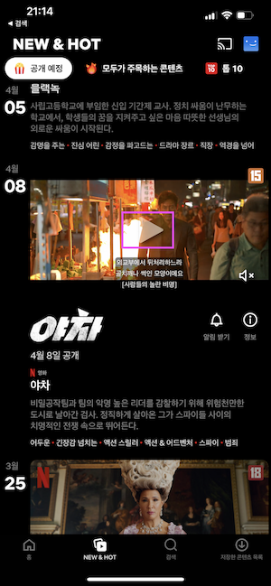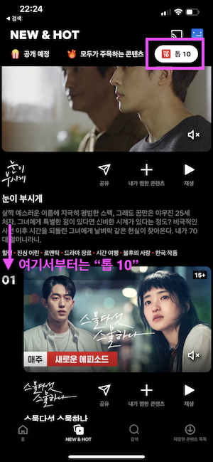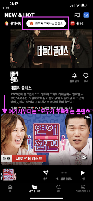아울러 기존에는 공개 예정인 콘텐츠만 있었는데, 지금은 공개 예정인 콘텐츠 밑에는 이어서 "모두가 주목하는 콘텐츠"가 나옵니다. 그리고 모두가 주목하는 콘텐츠 밑에는 이어서 "톱 10" 콘텐츠가 나옵니다. 이렇듯 공개 예정 뿐만 아니라 주목받고 있는 콘텐츠와 톱 10까지 소개하는 메뉴가 되면서 메뉴 이름을 "공개 예정"에서 "NEW & HOT"으로 변경한 것 같습니다.