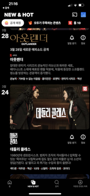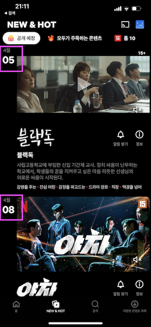 2. NEW & HOT : 공개 예정 날짜 가시성 향상, 알림 설정 영역 제거