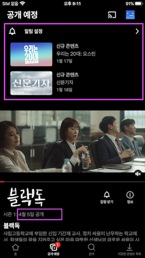 - 콘텐츠 타이틀 하단에 작게 공개 예정 날짜가 있음