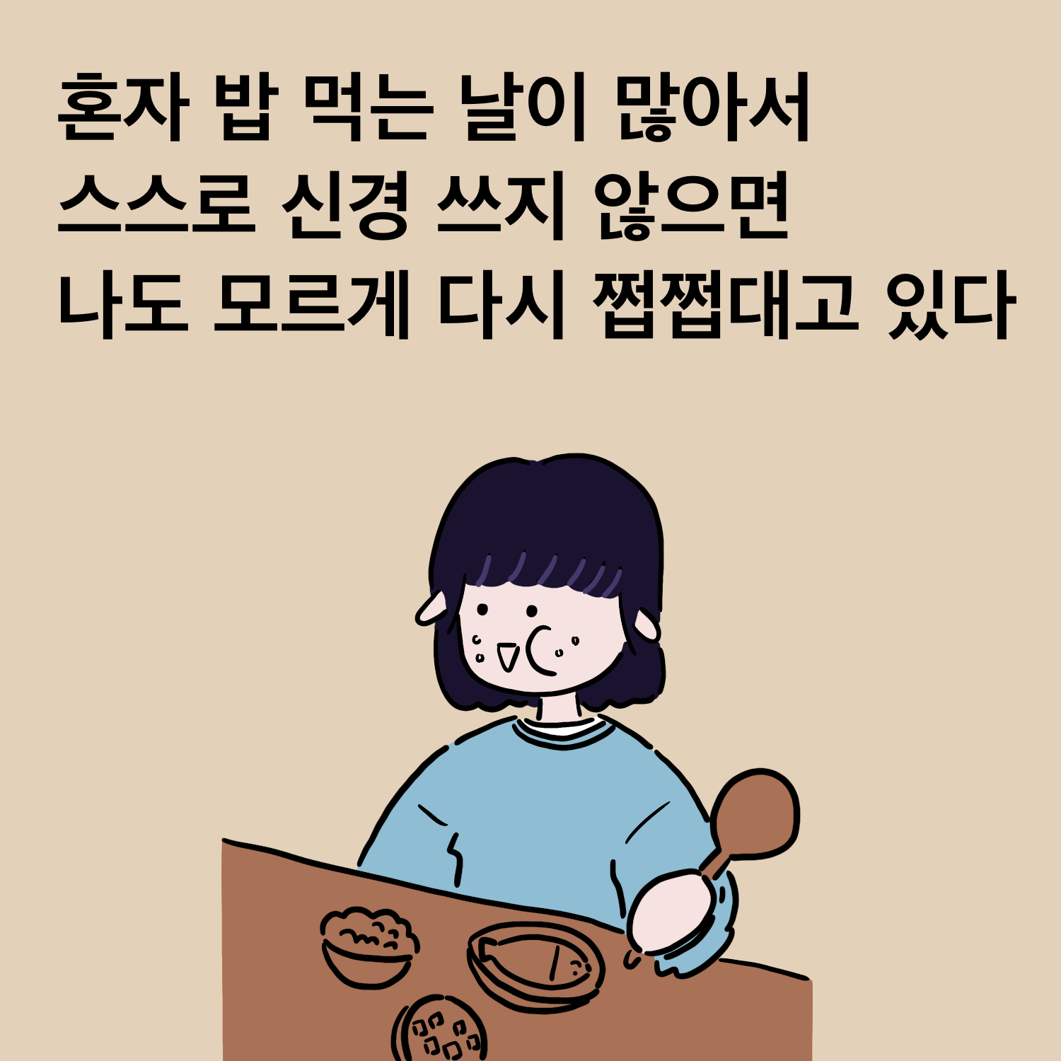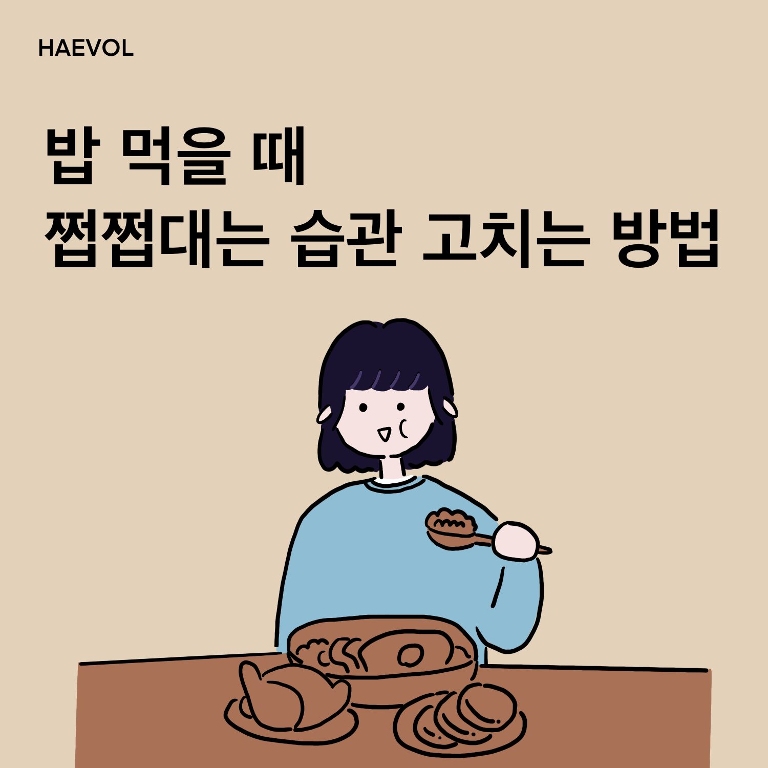 앞으로 쩝쩝대지 말아야지 하고 다짐해도, 밥을 먹다 보면 나도 모르게 쩝쩝대고 있는 경우가 많습니다. 누군가 지적해 주면 좋겠지만, 누구나 타인에게 싫은 소리 하는 게 쉽지 않을 것입니다. 또 최근에는 혼자 밥먹는 일이 많아져서 누군가의 도움을 받기란 쉽지 않습니다.