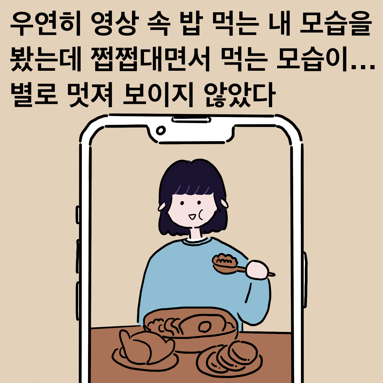 앞으로 쩝쩝대지 말아야지 하고 다짐해도, 밥을 먹다 보면 나도 모르게 쩝쩝대고 있는 경우가 많습니다. 누군가 지적해 주면 좋겠지만, 누구나 타인에게 싫은 소리 하는 게 쉽지 않을 것입니다. 또 최근에는 혼자 밥먹는 일이 많아져서 누군가의 도움을 받기란 쉽지 않습니다.