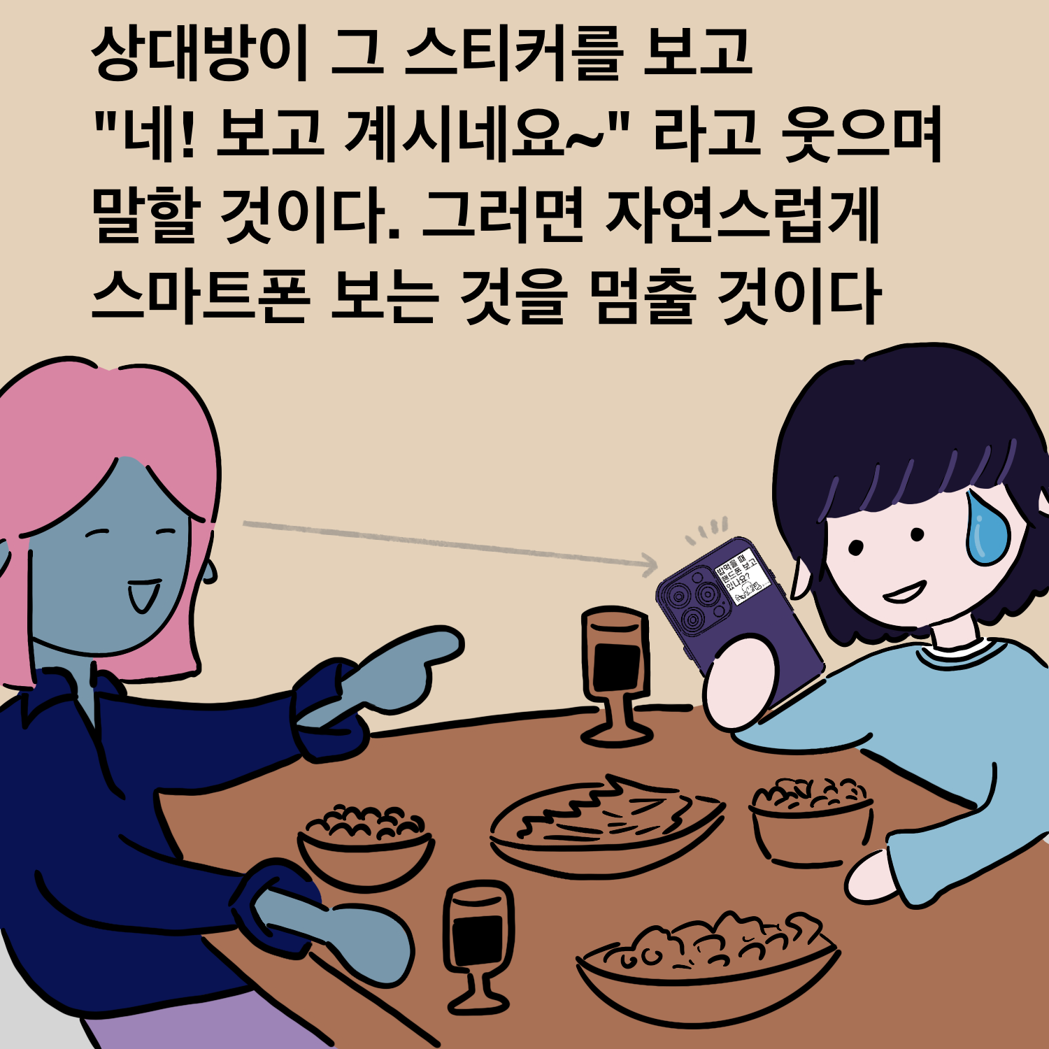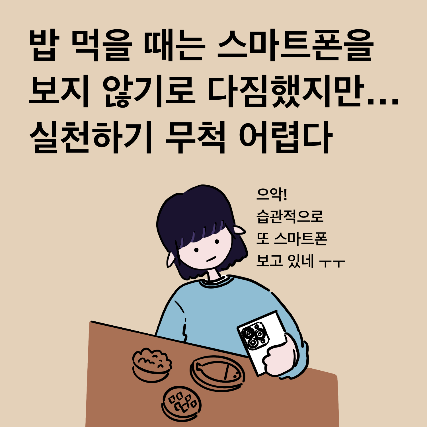 앞으로 밥먹을 때 스마트폰을 보지 않겠다고 다짐해도, 밥을 먹다 보면 나도 모르게 스마트폰을 보게되는 경우가 많습니다. 누군가 지적해 주면 좋겠지만, 누구나 타인에게 싫은 소리 하는 게 쉽지 않을 것입니다.