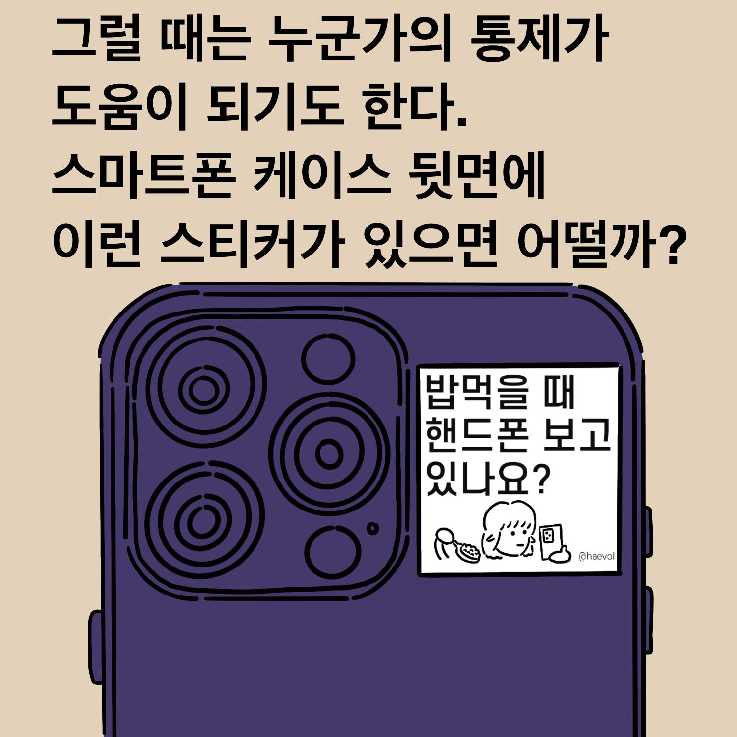 그래서 생각한 것이 핸드폰 뒤에 밥먹을 때 스마트폰을 보고 있나요? 라는 스티커를 붙이는 것입니다. 그러면 밥 먹을 때 스마트폰을 보고 있으면 이 스티커가 상대방에게 보이게 되고, 그러면 자연스럽게 상대방이 스마트폰을 보고 있다고 말해주며 분위기도 좋아지고 습관도 고칠 수 있을 것 같습니다.