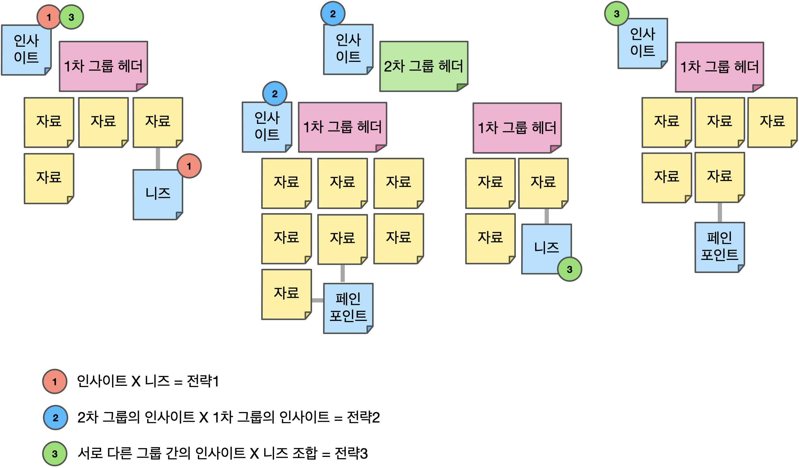 인사이트와 니즈 또는 페인포인트가 조합되어 전략이 나올 수도 있고, 다른 그룹간의 인사이트들을 조합해 전략이 나올 수도 있다. 또는 조합없이 하나의 인사이트에서 바로 전략이 나올 수도 있다.