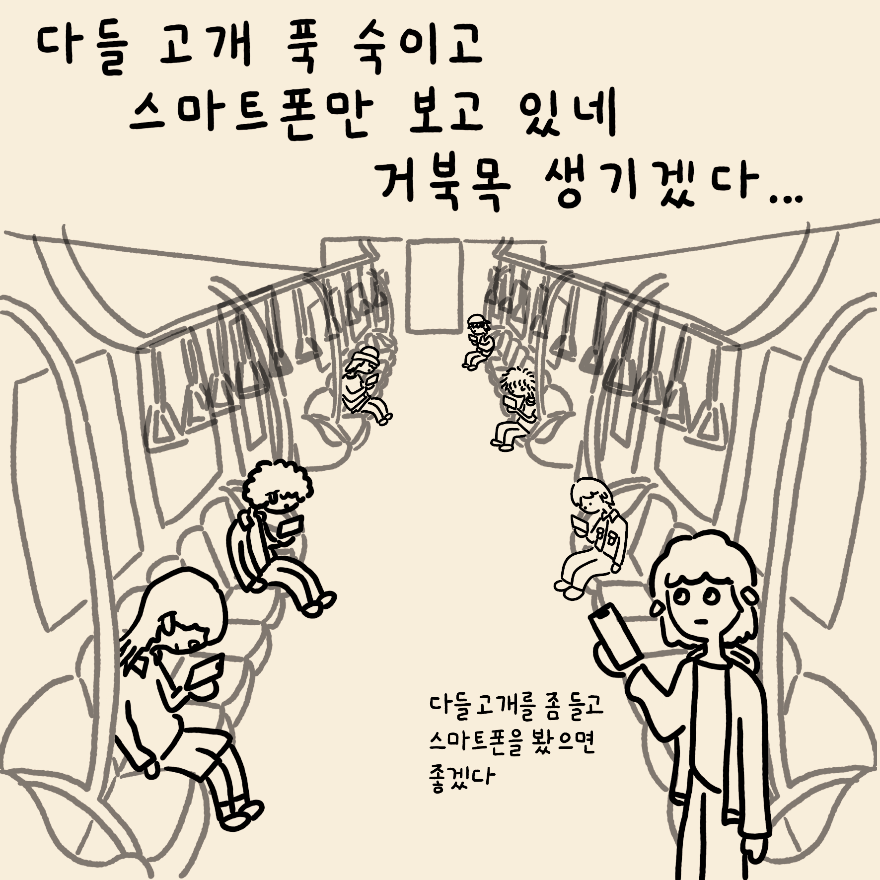 거북목을 넘어 일자목이 되면 두통까지 이어져서 일상 생활에도 큰 피해를 줍니다. 특히 좋은 스펙의 스마트폰은 무거워서 스마트폰을 든 팔은 자연스럽게 점점 내려가고 이에 따라 고개도 점점 내려가는 것 같습니다. 스마트폰을 사용하는 연령대가 점점 어려지면서, 어린 나이때 부터 거북목 증상이 오지 않을까 걱정이 됩니다. 스마트폰 제조사가 책임감을 가지고 거북목을 예방하는 기능을 스마트폰 자체 기능으로 도입하면 좋겠습니다.
