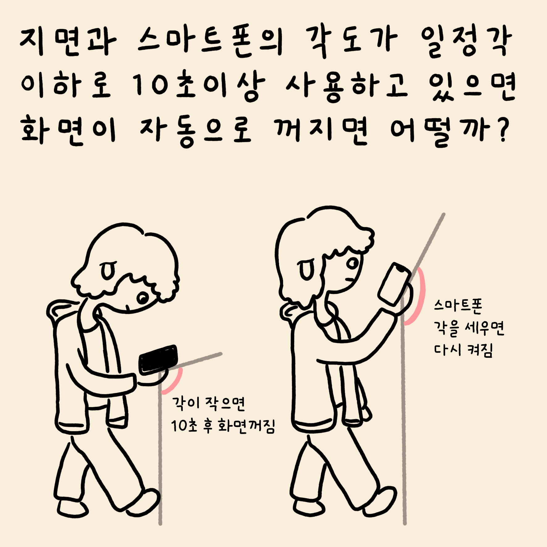 지면과 스마트폰의 각도가 너무 작으면 화면이 자동으로 꺼지면 어떨까?