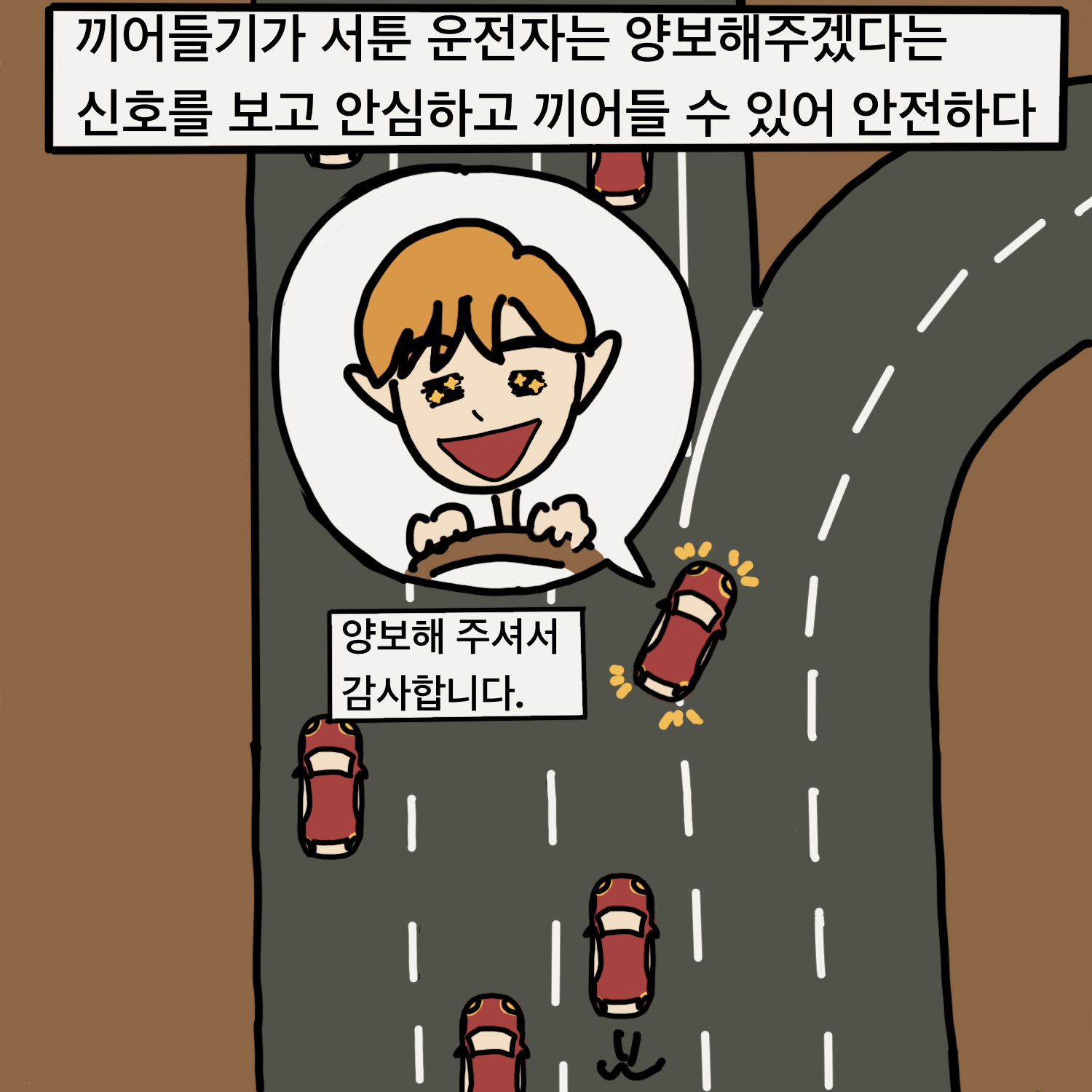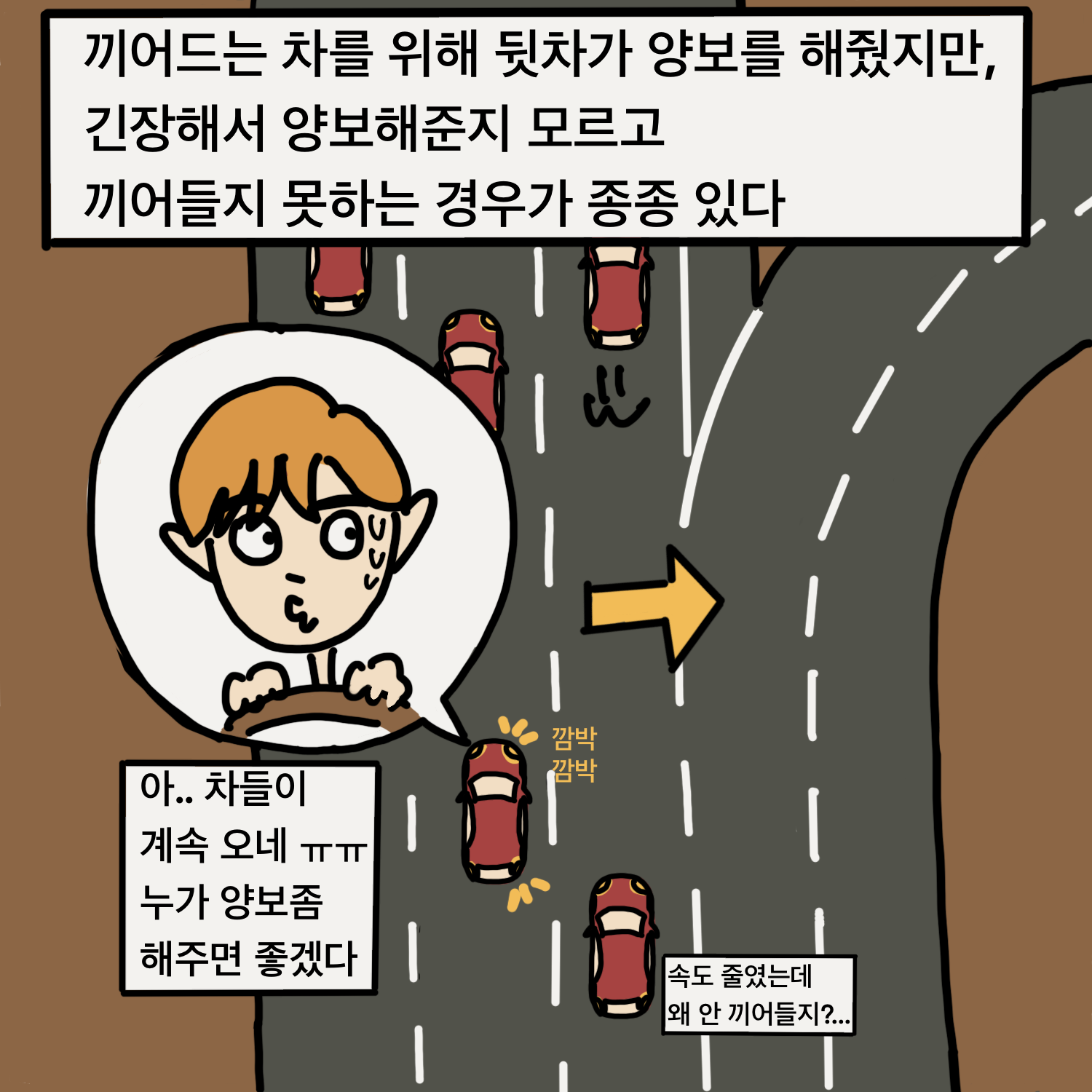 앞에서 끼어드는 차량을 위해, 뒷차는 속도를 줄여줬지만, 앞차가 이를 인지하지 못하고 끼어들지 못하는 경우가 있는 것 같습니다. 저도 초보운전 시절에 , 특히 고속도로에서 뒷차가 속도를 줄여줬는지 판단하기 어려웠습니다.