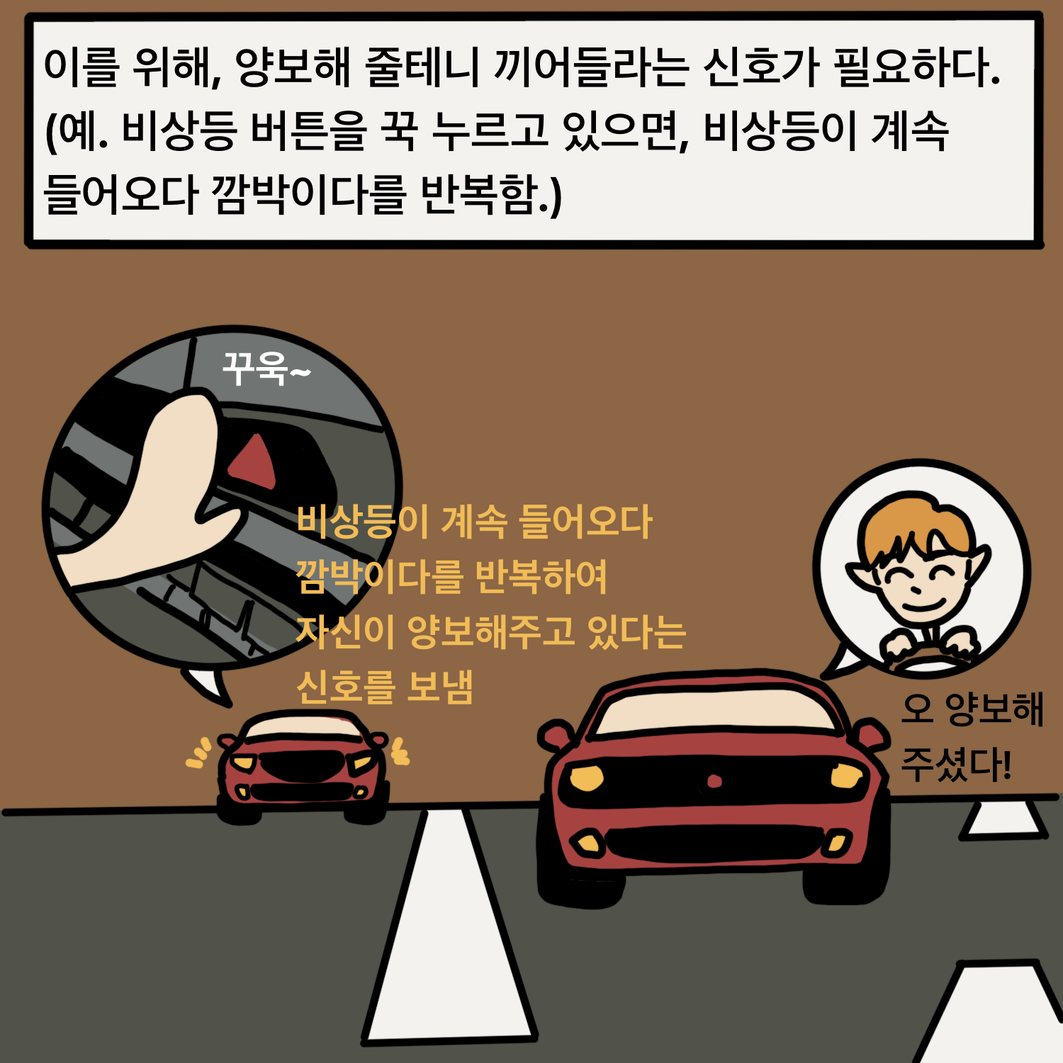 뒤에 자동차가 자신이 양보해 주고 있음을 앞차에 알려주는 비상등 신호가 필요하다