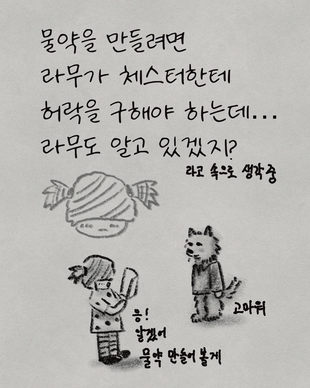 "그런 중요한 절차를 왜 지금에서야 말씀하시는 거죠?" 라무가 물었다. 멘디는 미안한 표정을 지으며 답했다. "체스터가 알아서 움직일 줄 알았어요. 그런데 물약 개발에 소극적인 모습을 보이고 있는 것 같아요." 멘디 입장에서는 같은 팀의 기획자에게 적극적으로 움직이라고 압박할 수 있는 위치가 아니었다. 결국 외부 클라이언트인 라무가 체스터를 설득해야 하는 상황이었다. 라무는 깊은 한숨을 내쉬었다.