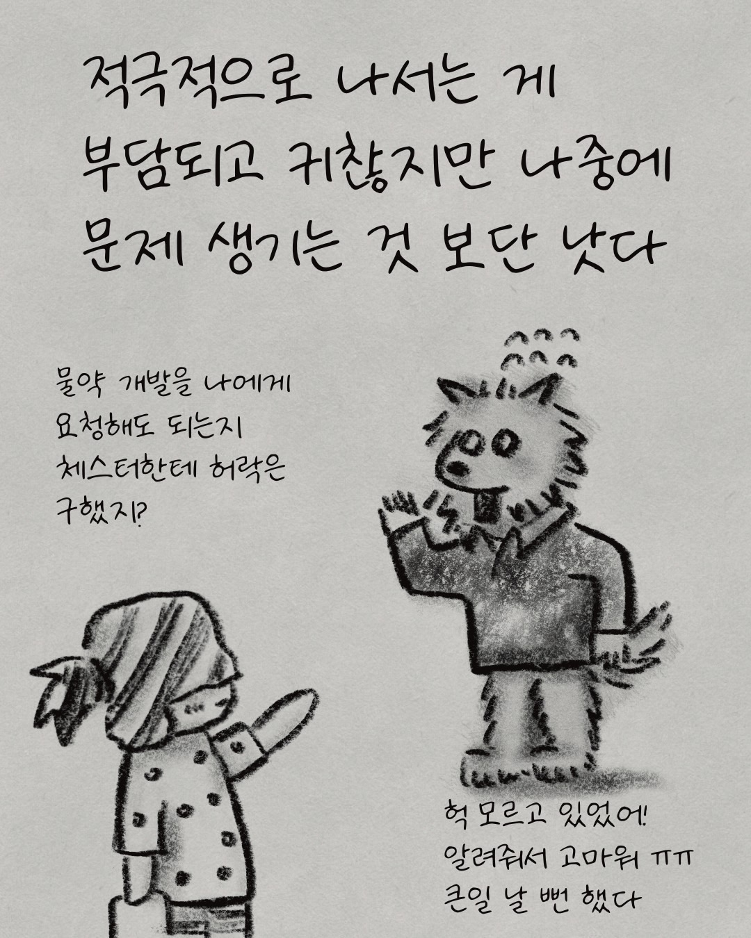 '아, 처음부터 내가 일정 검토를 위해 어떤 절차가 있는지, 내가 도와줄 것은 없는지 물어봤어야 했는데...' 그는 상대방이 전문가니까 알아서 잘 해주겠지 하고 안일하게 생각했던 자신을 반성했다. 전문가일수록 복잡한 내부 절차와 이해관계가 있을 수 있다는 것을, 이번 일을 통해 뼈저리게 깨달았다. 라무는 마음속으로 다짐했다.